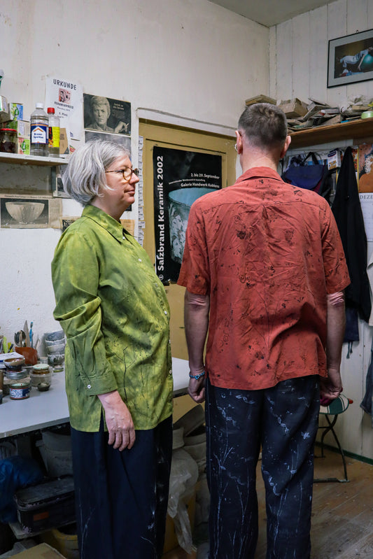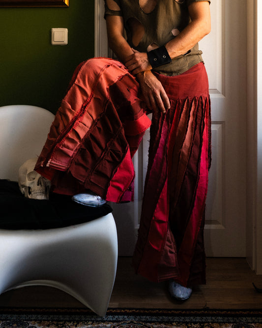 Aaron Pinkert represents artisanal upcycled fashion in Leipzig, redefining style beyond seasonal trends and gender norms. Each piece is crafted through the upcycling process, where existing materials and garments are transformed into something new. Instead of being completely recycled, these fabrics are reimagined with new cuts, colors, and added elements, creating one-of-a-kind, high-quality pieces. This results in unique, qualitative and special pieces that get their own history and are made to wear.